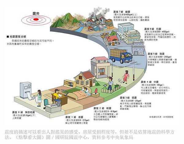 震度的描述可以看出人對搖晃的感受、房屋受損程度等,但並不是估算地震的科學方法。(點擊看大圖)圖/國研院國震中心,資料參考中央氣象局