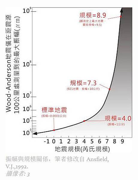 振幅與規模關係,筆者修改自 Ansfield, V.J.,1992.