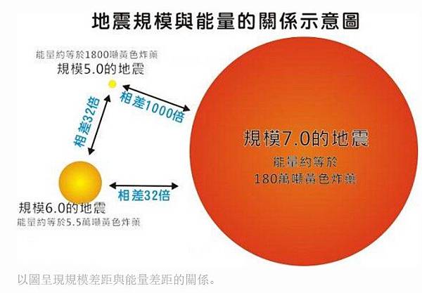 所以,規模就是單純的「大小」,雖然它和能量大小也有關,但一般大眾要直接從數值差異來推估能量大小也很難,或許也因為如此,媒體在報導地震時,常會詢問氣象局後,報導「相當於幾顆原子彈」、「相當於幾次九二一地震」等描述。不過,其實拿規模來細究釋放的能量到底有多少,意義是有限的,因為規模不能完全代表搖晃程度,更不能代表災情。規模 7.0 的地震,發生在距地表 10 公里內和發生在 100 公里深處,其造成的震度相差可遠了!