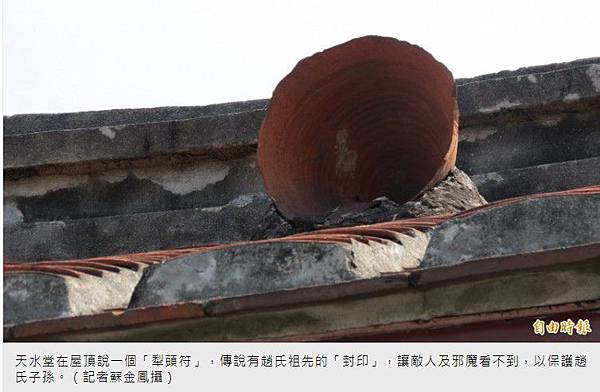 此外,天水堂的屋頂有至今仍保留一座形狀像喇叭的「犁頭符」,趙政忠表示,根據耆老的說法,古祖先把「公廳」設在蜂穴上,希望能夠多子多孫,畫了張符咒,就是讓外人或者邪魔看不到趙家,不讓外入入侵,保護著趙家子孫。