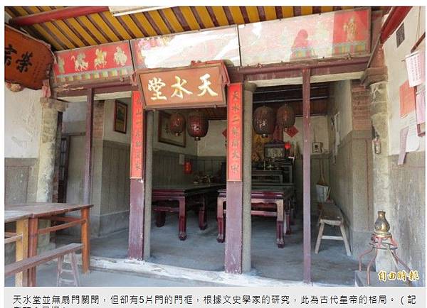 天水堂並無扇門關閉,但卻有5片門的門框,根據文史學家的研究,此為古代皇帝的格局。(記者蘇金鳳攝)
