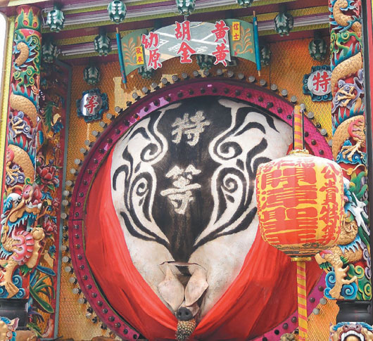 昨天早上豬公繞著大溪鎮內遊行,隨後就讓信徒大快朵頤,吃一頓保平安的豬公大餐。唯一參加豬公比賽的黃金原說,今年剛好輪到黃姓輪值,自己只是表達敬神的心意而已,對於比賽式微則不予置評。