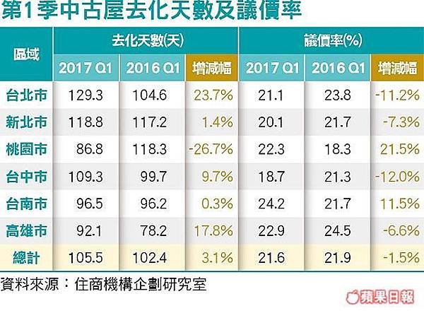 住商機構企劃研究室統計今年及去年Q1的中古屋去化天數及議價率,全台六都去年Q1平均約102天、也就是一間中古屋委託給房仲後要102天才賣掉,今年則增加3天至105天。六都中包括台北市、新北市及台中市,皆超過均值,其中又以台北市成交最困難,平均1屋得賣129.3天。