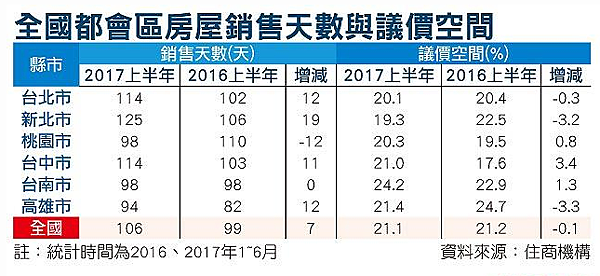 同時,住商機構統計,在六都的銷售天數表現上,新北市增 19 天最多,桃園減少 12 天最吸睛;議價空間上,高雄減少 3.3 個百分點,台中卻增加 3.4 個百分點。