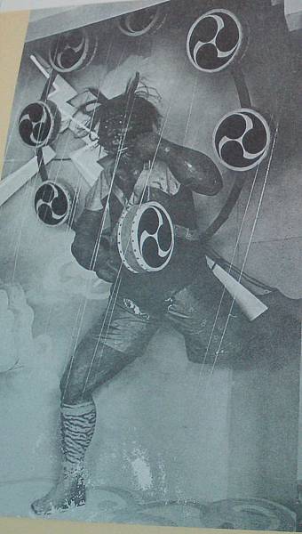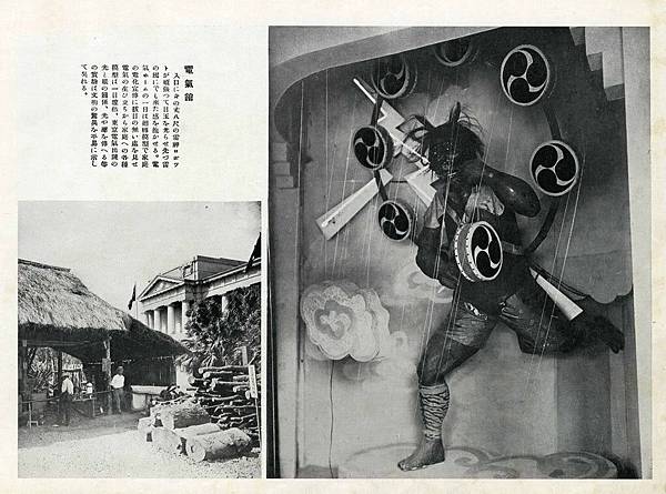 "電氣館" 出現日本雷神人偶( 8尺高)(台灣話叫雷公), (雷神的臉部看起來有點奇怪), 因為雷神帶來雷電之故吧? 環繞排列的7個小鼓, 是用來表示發出"轟隆~ 轟隆~" 雷 ...