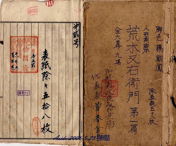 有台灣總督府檢驗章的皇民化布袋戲抄本-楊朝鳳屏東人,原是電影辯士,擅長說話及編劇-黃俊雄的父親黃海岱專程去屏東聘請來虎尾-擔任五洲園人形劇團的編劇(腳色)電影辯士是以前鄉下看洋片,在旁邊說劇情的人-因為六七十年前聽不懂洋文,看不懂中文字幕-電影辯士是以前默片時代的旁白員