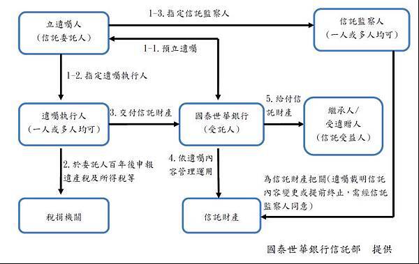 隨著少子化趨勢及國人普遍晚婚,許多國人擔心萬一不幸身故,身後遺產將成為家人爭產的導火線或恐遭他人侵占詐騙。國泰世華銀行張齊家協理指出,國人可透過自書或代筆等方式預立遺囑,在遺囑中寫明各種財產的分配方式,包括不動產、股票及現金等,並指明由哪些繼承人或受遺贈人分別或共同繼承,此外也可於生前與受託銀行討論遺囑有關之信託約定,包括要交付信託的財產項目及給付條件等。若自己未來不幸身故,則由遺囑中指定的遺囑執行人,協助申報及繳納遺產稅等稅捐後,再依遺囑內容,分配遺產並將要交付信託之遺產交付信託。(遺囑信託架構圖如下方)