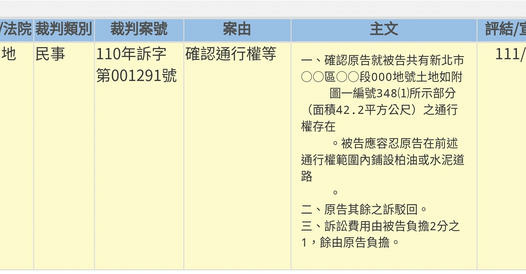 袋地通行權的勝訴判決主文,當事人購買土地後,鄰地所有權人在土地上設圍牆大門上鎖,阻礙通行長達6年,審理期間鄰地所有人同意拿掉門鎖,法院判決通行權存在保障當事人不會再受到阻撓