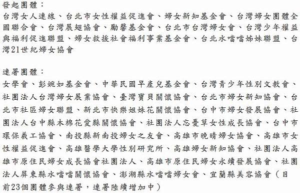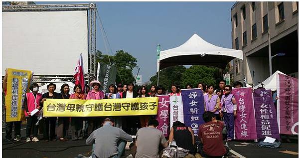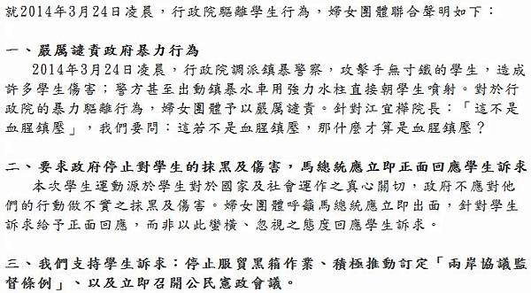 針對政府在24日凌晨採用警力驅離占領行政院的群眾,包括台灣女人連線、台北市女性權益促進會、婦女新知基金會及勵馨基金會等20多個婦女團體今天(25日)上午聯合在立法院反服貿抗爭現場發表3點聲明,除了嚴厲譴責政府的暴力行為外,並要求政府停止對學生的抹黑及傷害,馬總統也應立即正面回應學生的訴求。-------------link-----------------------------