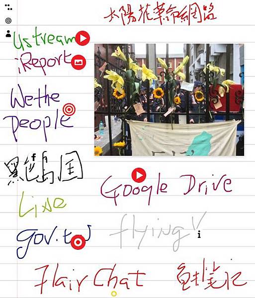 Google所提供的功能在這回學潮裡的運用非常多,除了用Google Drive來存放影片外,又如以Google協作平台製作「反服貿粗暴過關 公民佔領立法院抗爭資訊彙整」,以Docs製作「反黑箱服貿 守護民主之夜 現場需求」請求外界支援等,真是發揮得㵉漓盡緻。