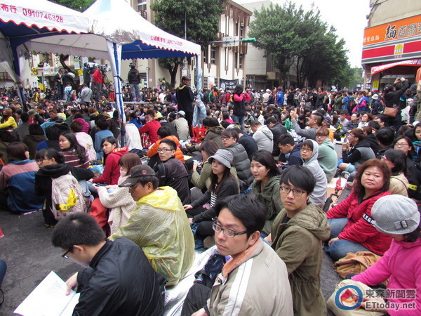 ▲「反反服貿」群眾在鎮江街口叫囂,「反服貿」靜坐群眾則好整以暇地聽演講。(圖/記者劉康彥攝)