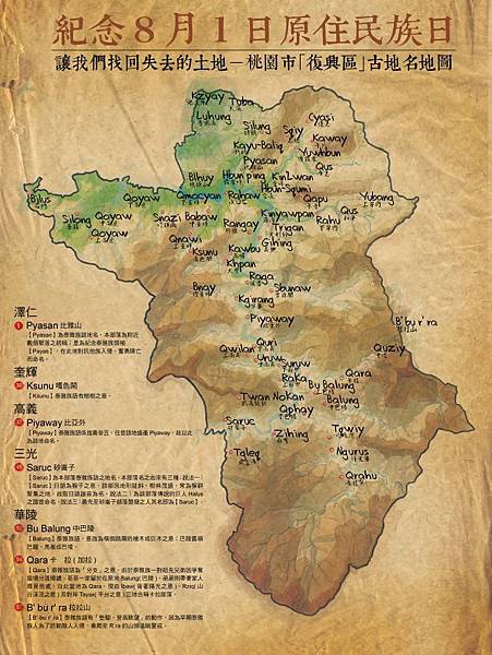 為紀念8月1日原住民族正名紀念日,桃園市政府原住民族行政局發行「讓我們找回失去的土地—桃園市復興區古地名地圖」,圖中清楚標註復興區各部落位置,同時還以泰雅族文字拼寫出古地名,重現許多幾乎快失傳的古地名。