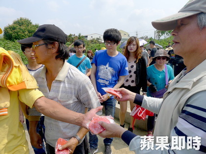 儀式結束後發放象徵平安的紅龜。(江明得提供)