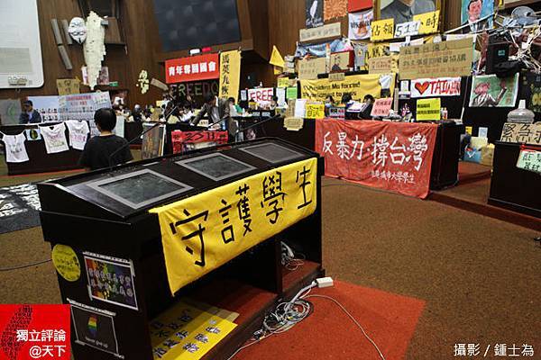 太陽花學運占領議場活動,今日下午5時30分展開退場活動。學生先宣讀人民議會意見書,後,在議場主席台上方掛起「人民議會」布條,並將議事槌放到主席台上。