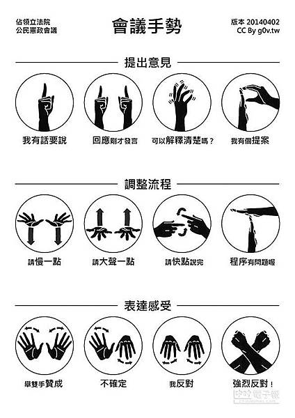 太陽花學運倒數前一晚公民行動會議採用「占領華爾街」運動手勢,讓台下所有人無論贊成反對或疑惑,伸手就能溝通。