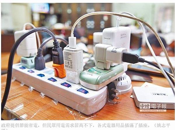 政府提倡節能省電,但民眾用電需求居高不下,各式電器用品插滿了插座。(姚志平攝)