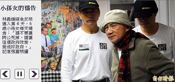 由反核團體組成的「全國廢核行動平台」,昨天下午到晚間在凱道舉行廢核靜坐及晚會,民進黨前主席蔡英文、太陽花學運總指揮林飛帆等人都現身參與靜坐。有民眾看到蔡英文,哭著求她:「把現場民眾都帶往義光教會,救救生命不斷消逝的林義雄,跪求他別再禁食。」