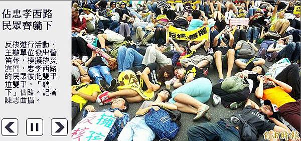 今(27)天下午登場的反核遊行,上萬人從凱道出發,行經佔領忠孝西路時,主辦單位全國廢核平台為了模擬核災發生,交通癱瘓情形,一聲令下後民眾包圍佔領忠孝西路,人多到連鎮暴警察都不得不撤退;隨後,現場響起核安警報,上千人就地躺下,場面相當壯觀。