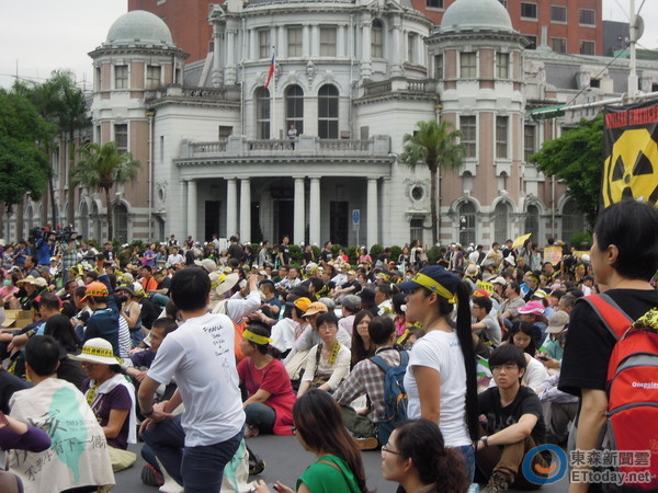 由「全國廢核行動平台」發起的反核四活動今(26)日下午在凱道展開,雖然下午天公不做美,一度下起傾盆大雨,不過仍沒有澆熄上萬人的反核怒火。上萬人於凱道上靜坐,表達反核訴求,除了主舞台陸續由學界、NGO團體代表、歌手上台發言、演唱歌曲,在景福門四週的帳篷也各自進行議題討論、紀錄片播放等活動,讓民眾可以針對核能議題發聲討論,晚上的「全民守護廢核決心」靜坐活動也將持續徹夜靜坐。