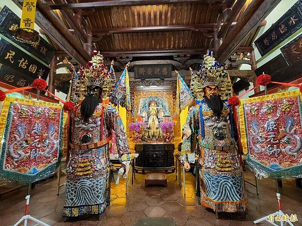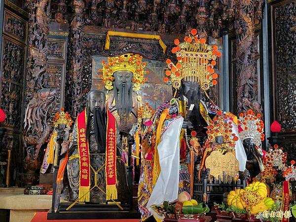 府城開基靈祐宮明代百字聖號玄天上帝(左)首次出轎入大上帝廟,與二帝合影成歷史性一刻。(記者王姝琇攝)