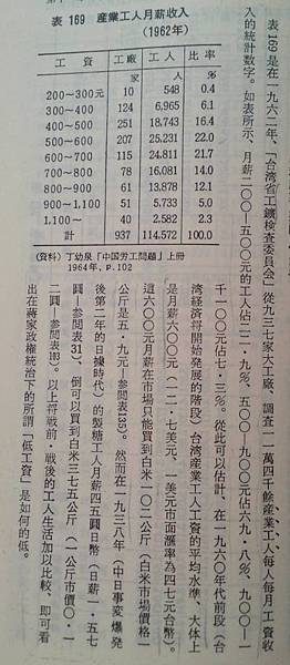1960年代前段產業工人生活慘狀,當時收入以可買到的白米102斤比較1938年製糖工人的白米375斤,收入倒退降幅72.8%