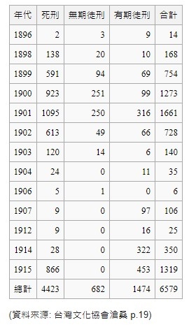 維基百科列出1896-1915的20年間背叛死邢4,423人,合計台灣人民抗日被判刑的人數為6,579人如下表。這些人數,若包含戰死或被屠殺的無辜民眾估計超過萬人。