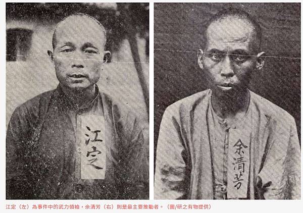江定(左)為事件中的武力領袖,余清芳(右)則是最主要推動者。(圖/研之有物提供)百年前「西來庵」那群農民,為何對余清芳死心踏地?除了慘烈結局,你更該懂的噍吧哖真相-風傳媒 https://bit.ly/3i1QGbM