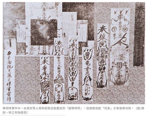 噍吧哖事件中,余清芳等人用來招募武裝農民的「避彈神符」,但還要搭配「吃素」才會發揮功效。(圖/康豹,研之有物提供)