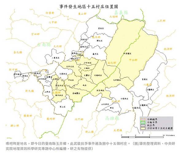 噍吧哖是地名,即今日的臺南縣玉井鄉,此武裝抗爭事件遍及圖中十五個村庄。(圖/康豹整理資料、中央研究院地理資訊科學研究專題中心所編繪,研之有物提供)