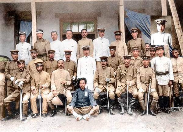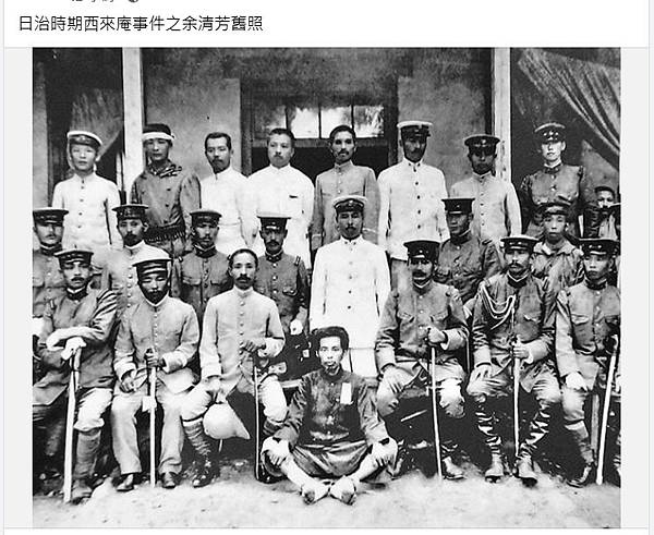 西來庵事件的抗日領袖余清芳被捕後,被安排與鎮壓的日本警察合影,彷彿一張展示獵物的紀念寫真。此照片刊登於大正四年(1915)「討伐紀念寫真帖」。