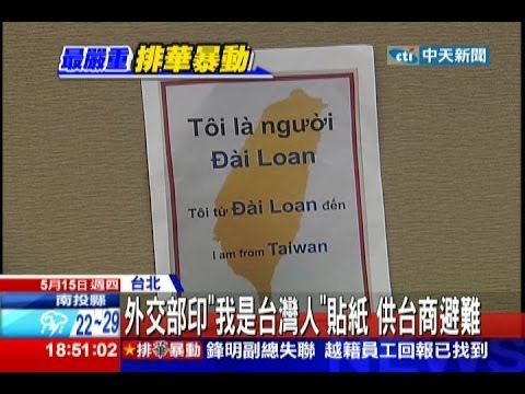 上一次釣魚台事件,結果是辦徵文比賽;這次越南排華,結果是印製貼紙寫上「我是台灣人」,難道這就是我國外交部的高度?中國早在五月七日就給在越的中資企業發通知,要求做好安全防範工作,我們的政府卻還在那邊趕製貼紙?
