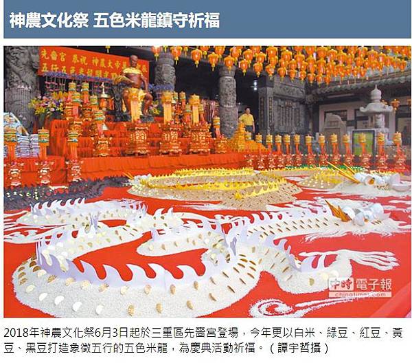 2018年神農文化祭將於6月3日起於三重區先嗇宮登場,繼去年首度推出「以米代金」後,今年更以白米、綠豆、紅豆、黃豆、黑豆打造象徵五行的五色米龍,為7天慶典活動祈福,今年除了傳統踩街遶境與健康路跑,還有熱鬧滾滾的文化祭典、民俗表演、藥膳品嘗、中醫義診等活動。