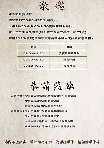 中共對台統戰動作頻頻,繼海峽論壇之後,「海峽兩岸共祭中華人文始祖伏羲典禮」今天在中國甘肅天水、新北市三重先嗇宮兩地舉行,據日前曝光的邀請函,可以看到今年的共祭典禮主辦單位為甘肅省公祭伏羲大典活動領導小組辦公室、甘肅省政府台灣事務辦公室、新北市三重區先嗇宮;承辦單位天水市政府公祭伏羲大典服務中心、天水市政府台灣事務辦公室、台灣中華伏羲協會、旺旺中時媒體集團、旺旺中時文化傳媒(北京)、中國電視公司。