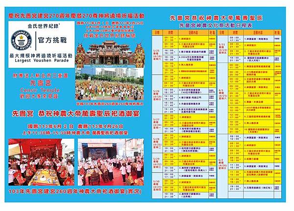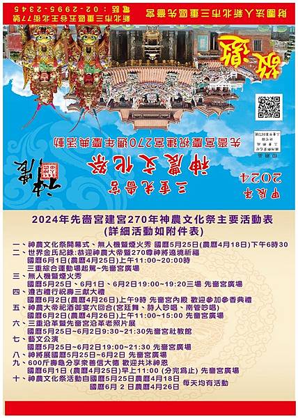 另外還有270尊神明將遶境的活動,取得世界金氏紀錄認證。還邀請全省30位名詩人創作,詠贊神農詩詞,並吟唱及著名瑪大藝術恆舞集原住民歌舞表演。現場還有老照片說故事,收集100年來三重地區開發歷史的照片。