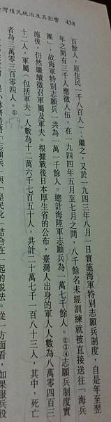 據日本厚生省在1973年的統計資料顯示,自1937年到1945年為止,台灣總督府共招募軍屬、軍夫126750名,從1942到1945年則徵募了軍人80433人,合計共207083名;這20多萬人中有30304人在戰場上陣亡,約總數的15%。