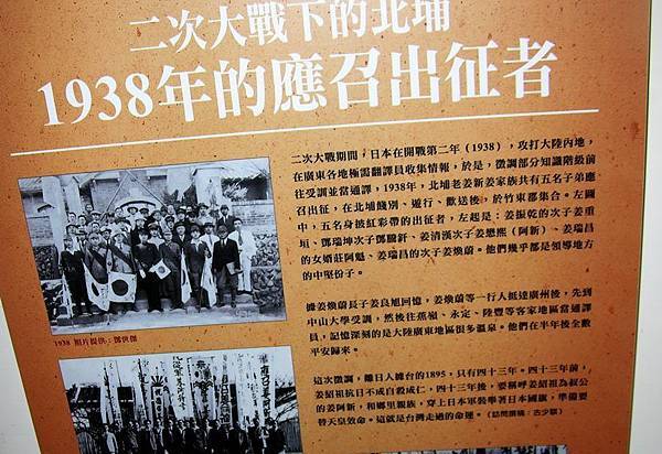 日本侵華戰爭期間,北埔老姜家族子弟姜阿新與姜重垣於1938年受徵召赴廣東地區擔任通譯,臨行前與家族長輩、兄弟及地方人士合影。背後的建築物是金廣福公館,前排左起依序為姜重山、姜阿新、姜瑞鵬、姜振驤、姜重垣,後排(左三)姜重枬、(左五)姜重烈,姜家三巨頭(姜阿新、姜瑞鵬、姜振驤)都在裡面。有趣的是當時日本人誤以為客家話與廣東話是相通的,結果是雞同鴨講烏龍一場。