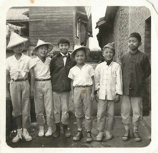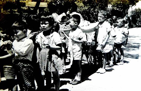 左起姜百塘、姜文滉、 曾正宗、傅步梯、筆者跟彭錦淵。小學二年級。在北埔戲院排演遊藝會。
