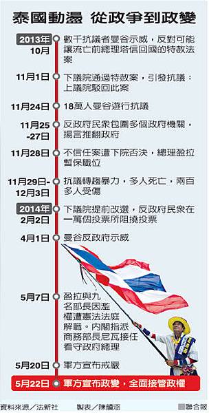 法新社引述泰國陸軍總司令帕拉育(Prayuth Chan-ocha)在電視直播的談話表示:「為使國家儘速恢復正常,由軍隊組成的國家維和委員會(National Peace Keeping Committee)、泰國軍隊以及皇家空軍和警察,在5月22日下午4點30分接管政權」。
