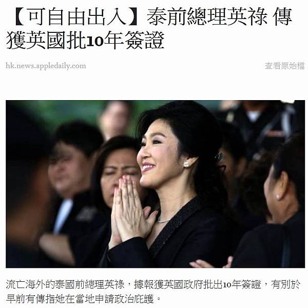【可自由出入】泰前總理英祿 傳獲英國批10年簽證