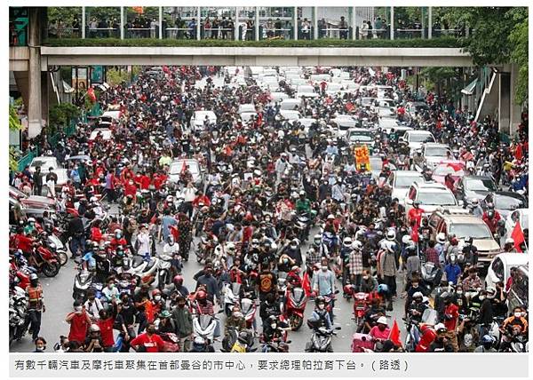 有數千輛汽車及摩托車聚集在首都曼谷的市中心,要求總理帕拉育下台。(路透)