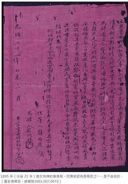 1895 年(光緒 21 年)賣女為婢的賣身契。奴婢被認為是賤民之一,是不自由的,(臺史博藏品,館藏號2003.007.0072)