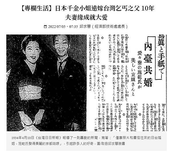 1934年4月10日《台灣日日新報》報導了一則轟動的新聞,寫著:「僅靠照片和書信往來的日台婚姻,施乾氏娶得美麗的京都姑娘」,引起許多人的好奇,圖/取自邱求慧臉書民報 Taiwan People News | 【專欄生活】日本千金小姐遠嫁台灣乞丐之父 10年夫妻緣成就大愛 https://bit.ly/3yidkpC