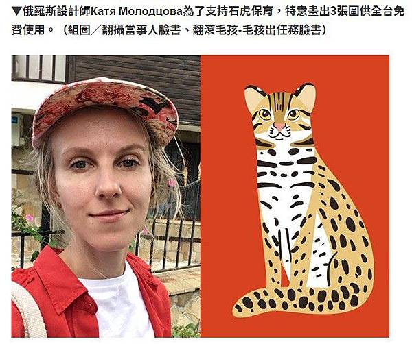 設計師江孟芝日前開直播自爆使用的圖片源自俄羅斯插畫家圖庫購買的花豹原圖,今日圖庫的作者Катя Молодцова霸氣宣布,為台灣繪製了一系列石虎圖片,將全部公開免費使用,為台灣石虎的保育盡一份心力。她得知台灣石虎遭遇的現況與存續危機後,表示願意免費繪製台灣石虎,並將其公開給台灣民眾與保育團體無償使用,希望與台灣人民站在同一陣線,為保育石虎盡一份心力,「您可點選分享,就是給予最大的支持!」「無私無償的大愛,這世間已少有了,感謝原作,也期望事件關係人能得到反省」、「作者好善良,知道事情緣由還願意幫台灣的石虎特別設計」、「真為苗栗縣政府感到汗顏」、「謝謝妳為台灣石虎盡心力」、「人也太好了吧!感動得快哭了」。 https://is.gd/Umcqvd