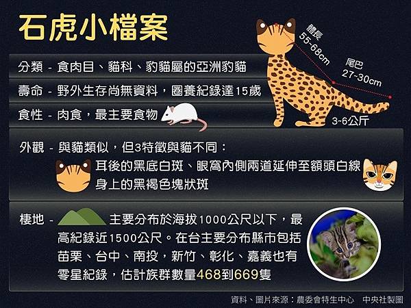 目前保育類野生動物石虎全台灣約剩400到600隻。 圖/苗栗縣政府提供