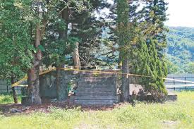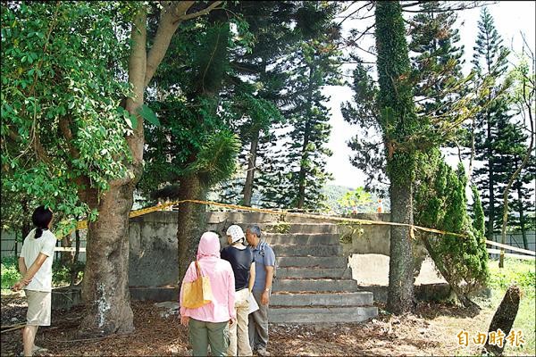 位於鹿野鄉龍田村崑慈堂旁的日治時期鹿野神社被圍起封鎖線,縱管處將進行復原工程,但社區居民擔心基壇被拆除,紛紛到場關心。(記者王秀亭攝)