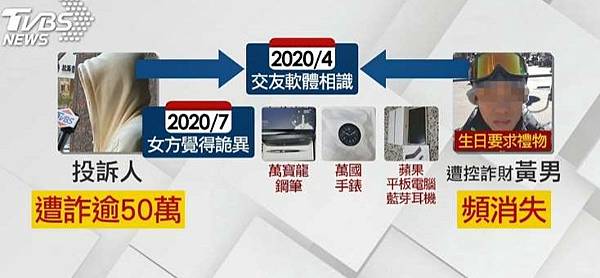 平時一身輕鬆打扮,愛穿POLO,行為紳士,都是利用甜言蜜語攻勢,讓女方卸下心房,投訴人說,去年4月,透過交友軟體認識黃姓男子,兩人很快墜入愛河,結果3個月後,對方開始裝可憐討錢,甚至生日時,還要求要萬寶龍鋼珠筆、萬國錶、蘋果平板電腦和藍牙耳機當禮物,結果東西送了、錢給了,對方卻開始搞消失,前前後後被騙了至少50萬,直到11月分手,才知道這被害人不只自己一個。