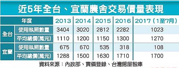 反觀價格上的變化,卻出現令人意外的走高趨勢。以宜蘭縣為例,2017年截至7月,農舍平均總價來到1700萬元,相較2013年平均的1288萬元漲約32%;而全台農舍交易總價,2017年平均落在1270萬元,同比2013年增加14.4%。