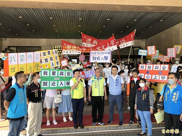 新竹縣竹北市100多名國中新生家長今天到新竹縣議會陳情,要求能夠讓孩子就近入學及保障教學環境品質。(記者蔡孟尚攝)