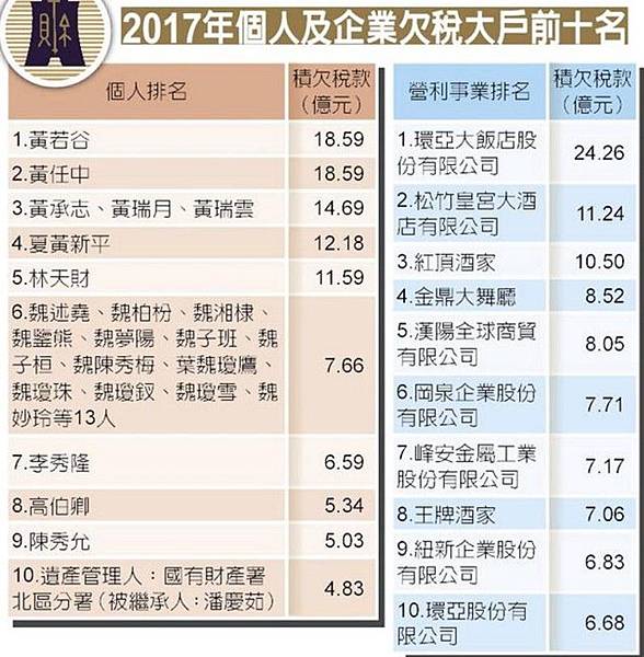 至於企業欠稅大戶,仍以環亞大飯店欠稅廿四.一一億元居首;首度擠進前廿名的松竹皇宮大酒店欠稅十.四八億元居次;岡泉企業欠稅七.六八億元排名第三;紅頂酒家欠稅七.五七億元排名第四;峰安金屬欠稅七.一五億元排名第五。