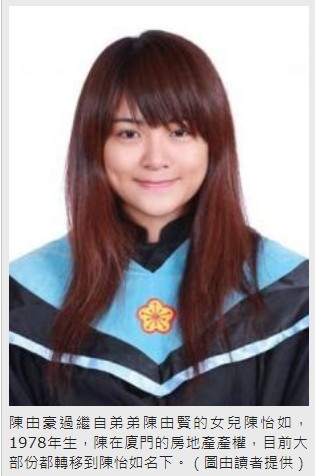陳由豪過繼自弟弟陳由賢的女兒陳怡如,1978年生,陳在廈門的房地產產權,目前大部份都轉移到陳怡如名下。(圖由讀者提供)